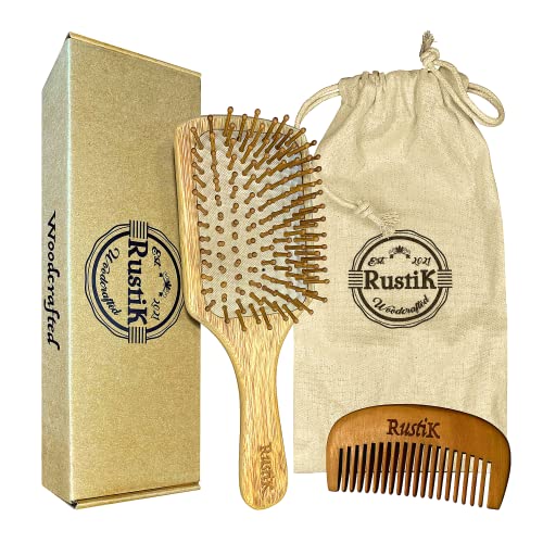 Bamboo Paddle Hair Brush Set By RustiK, Eco Friendly, Handmade, Anti Static, Gift set, Travel Bag, Pear Wood Comb, Woodcrafted For Men and Women.