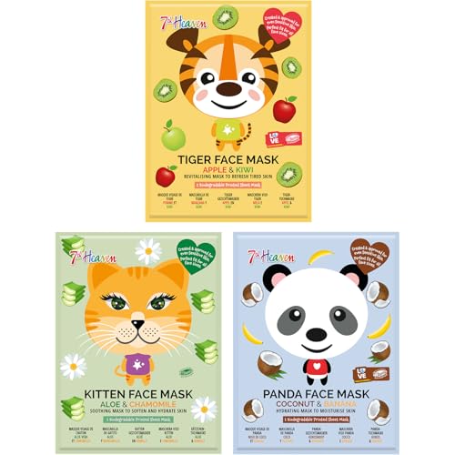 7th Heaven Party Animal Beauty Sheet Face Mask Skincare Set for Kids – Tiger, Kitten & Panda Printed Face Mask Sheet to Soothe, Hydrate & Revitalise Young Skin (Ages 8+)