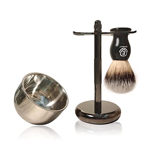 Premium Shaving Brush Kit-3 in 1 Shaving Brush Set for Men Includes Badger Synthetic Hair Shaving Brush,Stainless Steel Shaving Soap Bowl and Safety Stand for Mens Shaving Gift Set (Black)