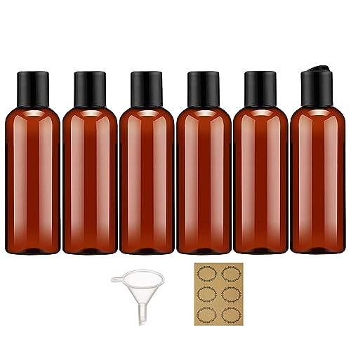 Apstaqeoo 6PC 100ML Plastic Bottles with Disc Top Flip Cap Empty Squeeze Bottle Refillable Travel Container Dispenser with Funnel Label TSA Approved for Liquid Lotion Toiletries Cosmetic(Brown)