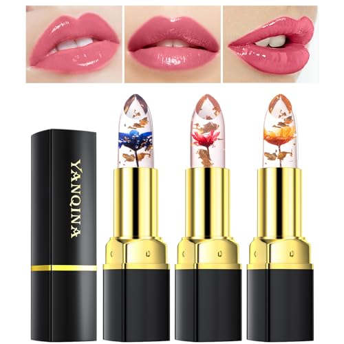 3Pcs Flower Jelly Color Changing Lipstick Set,Magical Crystal Temperature Color Change Flower Lip Gloss,Long Lasting Moisturizing Lip Balm,Covering Lip Lines