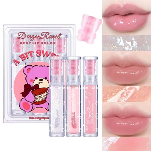 3PCS Bear Lip Glaze Jelly Lipstick,Liquid Lipstick, Hydrating Clear Lip Plumping Balm Moisturising Lip Gloss Combo Gifts for Women and Teenage Girls