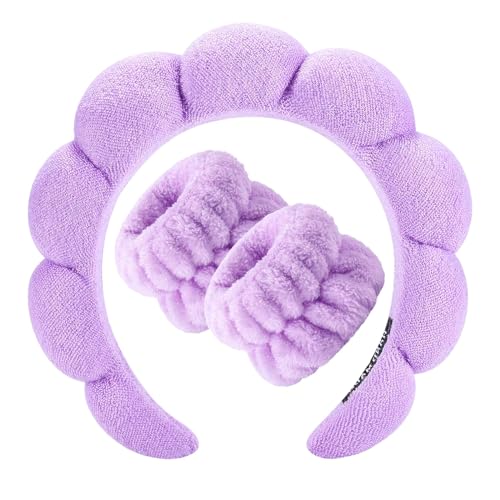 KWQINX Spa face wash headband and wristband set, headband for washing face, soft skincare headbands, hair and wrist band for washing face, bubble soft women’s skin care headband (Purple+wristband)