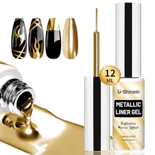 U-Shinein Metallic Painting Gel, Nail Art 3D Mirror Effect Gel Nail Polish, Painted Drawing Gel, Build in Thin Brush Soak Off Gel for Salon Home DIY Manicure, Gold