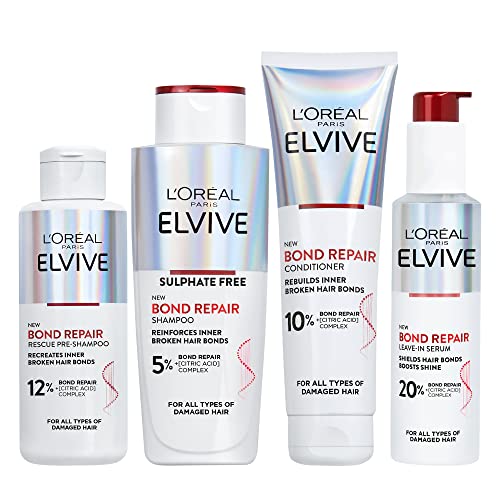 L’Oreal Paris Elvive Bond Repair Hero Set for Damaged Hair, Pre-Shampoo Treatment 200ml, Shampoo 200ml, Conditioner 150ml, Leave-In Serum 150ml, Intensive Repair Treatment, Rebuild Broken Hair
