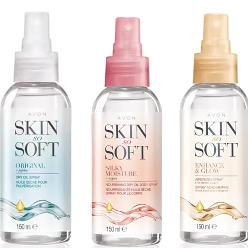 Discover the versatile Avon Skin So Soft Dry Oil Spray 150ml Trio Bundle, featuring three unique formulations: Original, Enhance and Glow, and Silky Moisture. Perfect for everyday skincare needs, this bundle offers the original dry oil formula known for its moisturising properties, the enhance and glow version which provides a beautiful shimmering finish, and the silky moisture variant ensuring ultimate hydration and smoothness. Ideal for multiple uses, from moisturising to enhancing your natural glow.