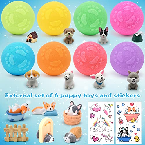 Puppy Bath Bombs Gift Set for Kids 8PCS Organic Natural Bath Bombs with Surprise Toys Inside Dog Stickers Bubble Bath Fizz Spa Birthday Gift for Women Boys Girls Dog Figurines Bath Toy