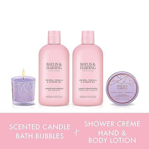 Indulge in the soothing and indulgent Baylis & Harding Jojoba, Vanilla & Almond Oil Luxury Candlelit Bathing Gift Set (Pack of 1) – Vegan Friendly. This luxurious collection features a rich blend of jojoba, vanilla, and almond oil, providing a spa-like experience in the comfort of your home. This gift set includes indulgent bath and body products, perfect for pampering and relaxation.