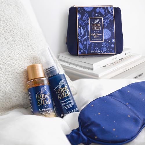 Feather and Down Night Garden Retreat Gift Set – Lavender and Chamomile Bubble Bath and Pillow Spray Bath Set with Eye Mask and Luxury Travel Pouch – Relaxing Gifts for Women, Vegan Friendly.