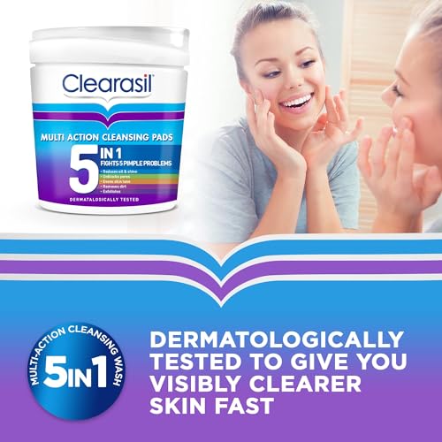Clearasil 5-In-1 Ultra Cleansing Salicylic Acid Pads, Face Exfoliating For Acne Prone Skin, Unblock Pores, Reduces Blackheads, Pimples & Excess Oil, Everyday Spot Prevention, Pack of 65.