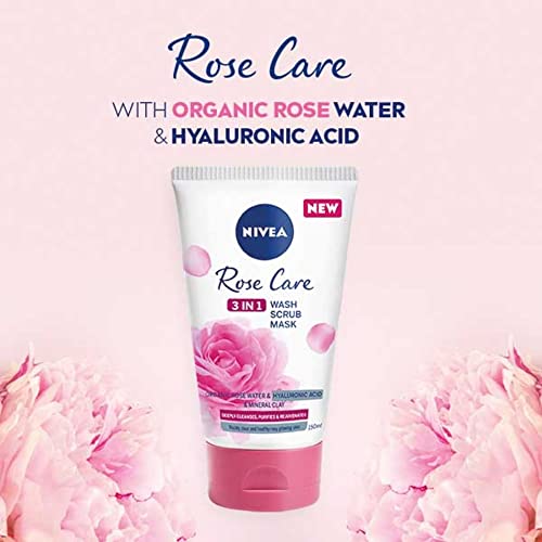 NIVEA Rose Care 3 in 1 Wash, Scrub, and Mask (150ml), All in One Face Scrub, Face Wash and Face Mask with Mineral Clay, Hyaluronic Acid and Organic Rose Water