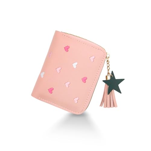 DOZNOZRI Small Purses for Women with Zip and Cards,Embroidery Heart Leather Small Purse with Card Holder and Coin Purse Women Tassels Pendant Pink Purses for Women Small Size Cards and Money