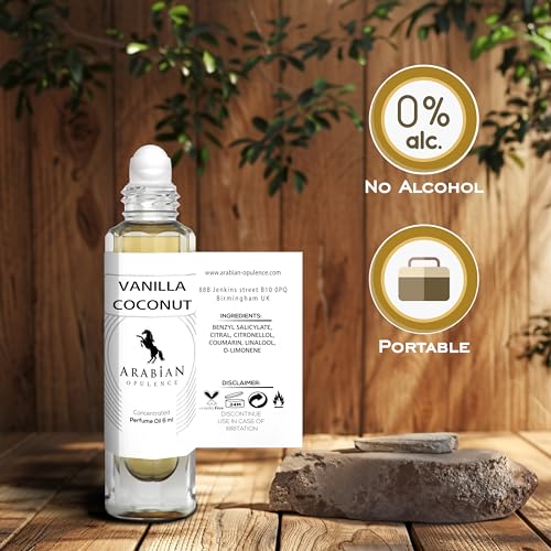 Arabian Opulence FR291 VANILLA COCONUT Concentrated Perfume Oil is a testament to elegance and longevity. Perfectly balanced for both men and women, this alcohol-free roll-on perfume features a harmonious fusion of rich vanilla and sweet coconut, creating a captivating and memorable scent. The oil-based formulation ensures a long-lasting fragrance, making it ideal for any occasion. The 6ml bottle is compact and travel-friendly, making it easy to carry your favourite scent wherever you go. Experience this opulent fragrance in different sizes to suit your style and needs. Dive into a world of enchanting aromas with Arabian Opulence, where each application offers a promise of sophistication and enduring appeal.