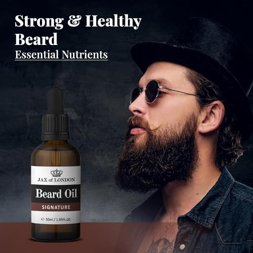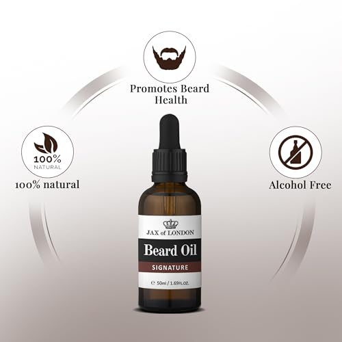 Jax of London Signature Beard Oil for Men 50ml, beard care oil, Beard growth oil for men, Consists of Vitamin E, Almond oil, Jojoba oil, Argan oil, Luxury scented beard oil, Menâs Cologne Fragrance