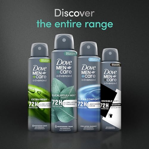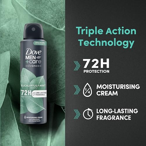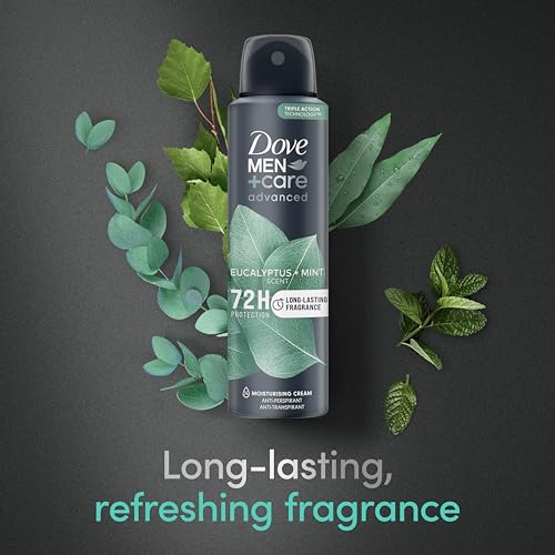Dove Men+Care Eucalyptus + Mint Antiperspirant Aerosol deodorant for men with 1/4 moisturising cream for 72h sweat and odour protection 6x 200 ml is a premium solution designed to maintain freshness and comfort throughout the day. Infused with the invigorating scents of eucalyptus and mint, this antiperspirant ensures 72 hours of reliable sweat and odour protection while its unique formula incorporates 1/4 moisturising cream, preventing skin irritation and maintaining smooth and healthy underarms. Available also in variations featuring the relaxing scent of Sage + Vetiver and the refreshing blend of Sandalwood + Orange.