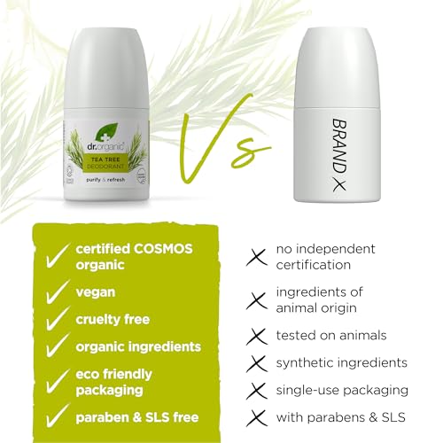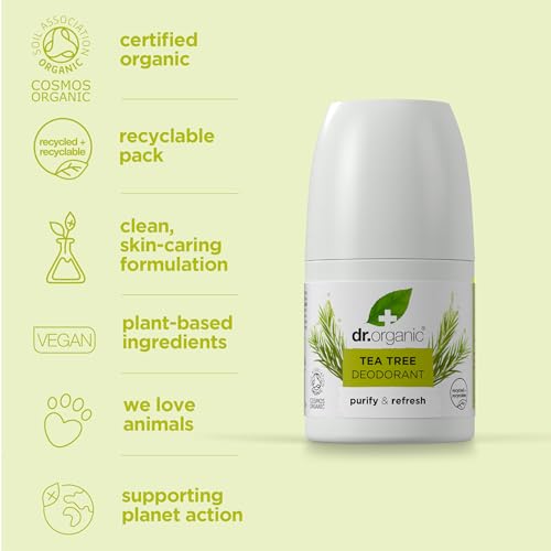 Dr Organic Tea Tree Deodorant, Aluminium Free, Mens, Womens, Natural, Vegan, Cruelty-Free, Paraben & SLS-Free, Organic, 50ml, Packaging may vary