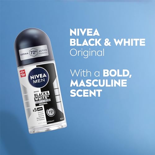 NIVEA MEN Black & White Original Anti-Perspirant Roll On (50ml), 72hr Anti-Sweat Roll On Deodorant for Men, No Stains on Black and White Clothes