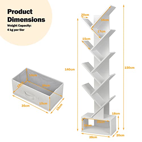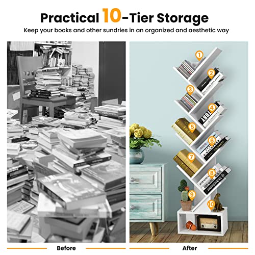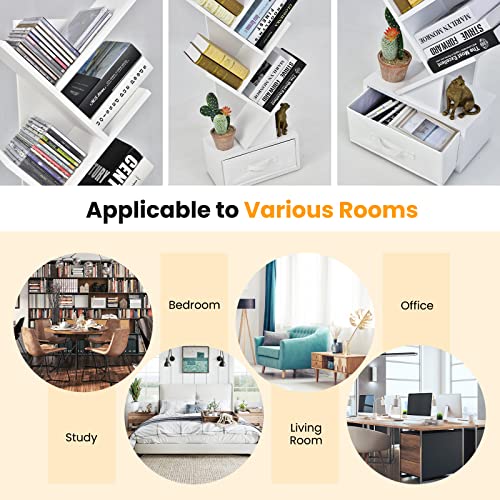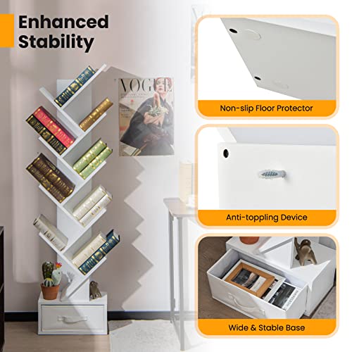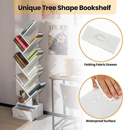 CASART 10-Tier Tree Bookshelf, Slim Tall Floor Standing Bookcase with Drawer & Wall Anchor, Wooden Display Shelving Storage Rack for Living Room Bedroom Office (White)