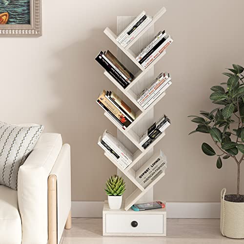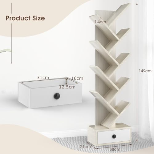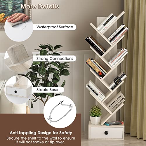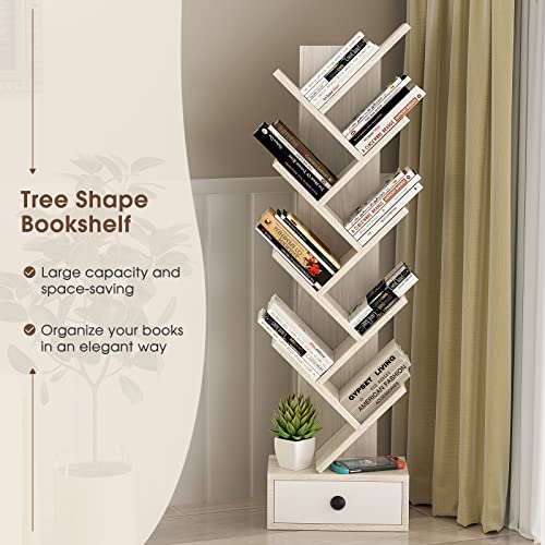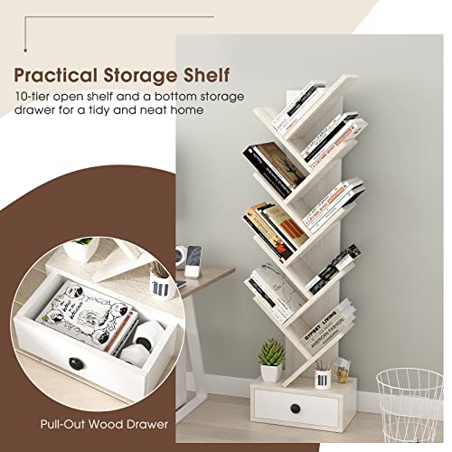 COSTWAY Tree Bookshelf, 10-Tiers Floor Standing Wooden Bookcase Storage Shelving Unit, Narrow Magazine Book Display Rack for Living Room, Bedroom and Office(Beige, with Drawer)