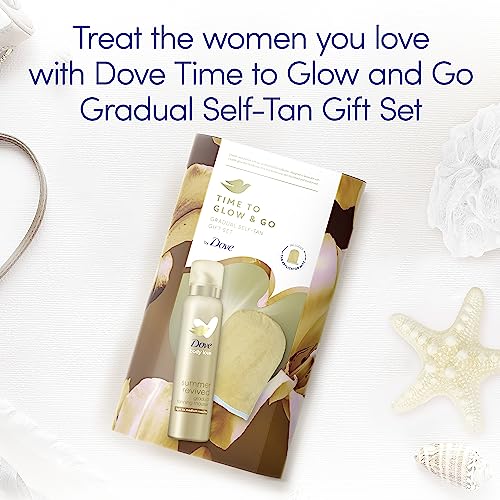 Dove Time to Glow and Go Gradual Self-Tan Gift Set with a tan applicator mitt is the ideal present to achieve a sun-kissed look year-round. It includes a nourishing gradual self-tanning lotion and a convenient applicator mitt for a streak-free, radiant finish. Available in light to medium and medium to dark variations to match different skin tones.