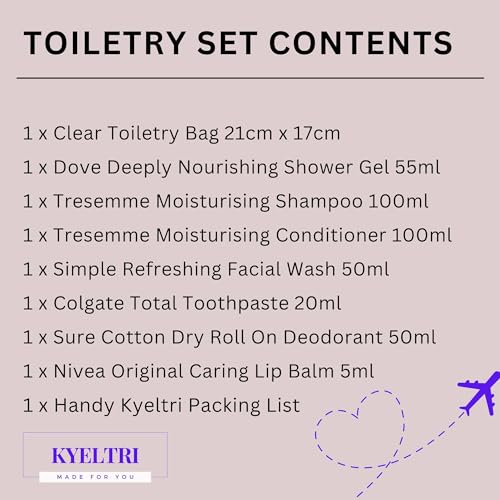 Ultimate travel convenience is at your fingertips with the Travel Toiletries for Women set. Perfect for holidays, vacations, overnight stays, and even hospital bag essentials, this travel-size mini toiletries set comes in a clear, airport security-approved bag with a handy Kyeltri checklist to ensure you pack all your essentials with ease. Enjoy stress-free travel and stay organised with this must-have kit.