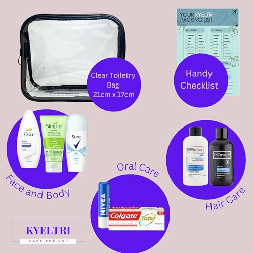 Travel Toiletries for Women – Travel Size Mini Toiletries Set for Holidays, Vacation, Over Night Stay, Hospital Bag Essentials – Clear Travel Bag – Airport Security Approved with Kyeltri Checklist
