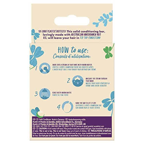 Aussie Moisturising Vegan Conditioner Bar with Australian Macadamia Nut, Solid Travel Toiletries for Damaged & Dry Hair (75G) Rich Lather, 96% Natural Origin, Cruelty Free & Recyclable Box