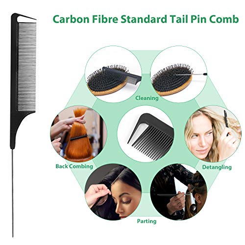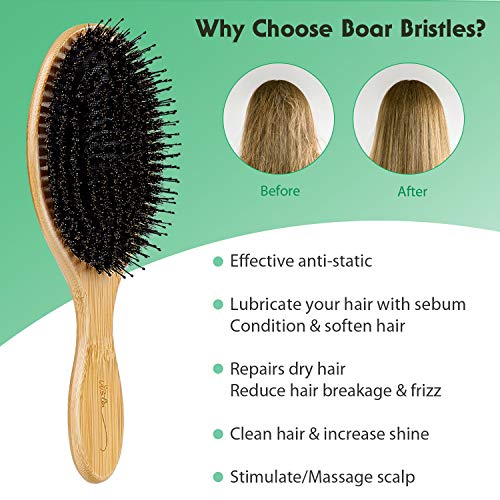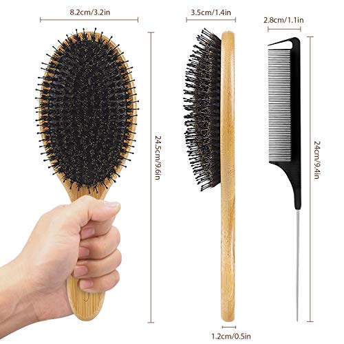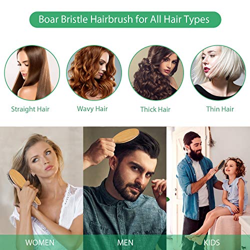 Boar Bristle Hair Brush Natural Bamboo Paddle Hairbrush with Tail Comb for Long Thick Curly Wavy Dry or Damaged Hair Round Hair Brush Adds Shine and Makes Hair Smooth Comb Set for Men, Women, Kids