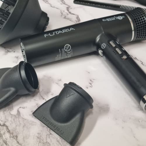 Electric Head Jog Futaria Hair Dryer: perfect for efficient and stylish drying. This lightweight hairdryer includes 2 nozzles and a diffuser, ensuring versatile styling. Enjoy fast drying with 3 temperature settings and 2 speed options, plus a cold shot feature. Available in classic black, ideal for all your blow-drying and styling needs.