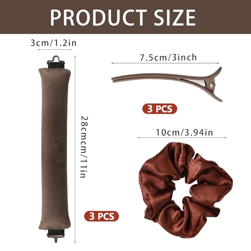 The 3Pcs Lazy Curlers DIY Hair Styling Tool includes soft fabric curling rods designed for long hair. These heatless curlers provide a safe way to achieve beautiful, natural curls overnight. The set features three dark brown curlers along with a matching hair tie and clip for secure styling. Suitable for all hair types, these tools ensure that your hair retains its natural moisture and avoids heat damage for healthy, shiny curls.