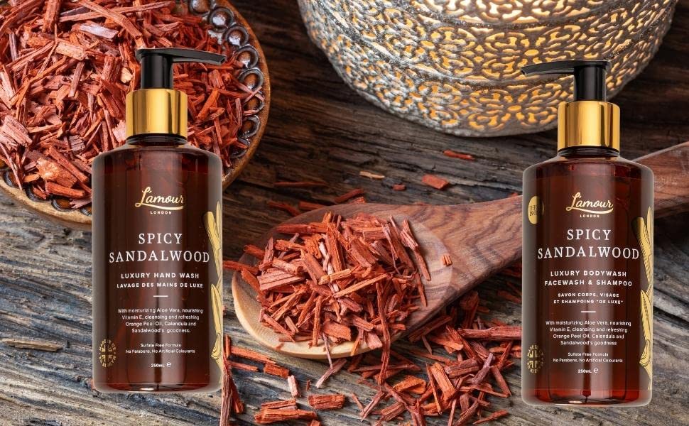 L’amour Natural | Spicy Sandalwood | Luxury Face Wash, Body Wash & Shampoo | Essential Oils | Sulphate Free | Gentle for dry and sensitive skin | 250mL