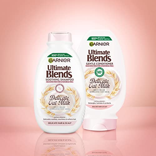 Discover the perfect solution for gentle hair care with Garnier Ultimate Blends Delicate Oat Milk Soothing Vegan Conditioner. Specially designed for sensitive scalps and fragile hair, this nourishing conditioner is enriched with oat milk and rice cream, offering a soothing and calming effect. Dermatalogically tested and vegan-friendly, it provides a delicate touch, transforming your hair to be soft, healthy, and manageable. This conditioner is also available in variations that include almond milk, catering to diverse hair sensitivities, and a complementary oat milk & rice cream shampoo for a complete hair care regimen. With a gentle, natural blend, it ensures maximum care without harsh chemicals.