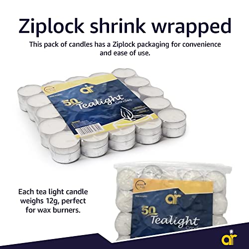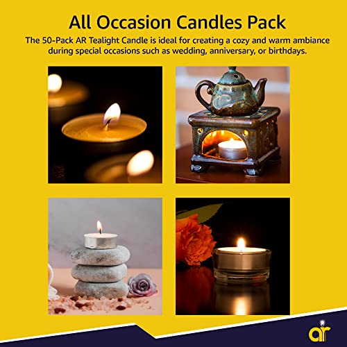AR Tea Light Candles – Pack of 50 White Candle Lights (12 Grams) – Clean and Long Burning 4-Hour Tealights in Resealable Bag – Versatile Small Candles for Mood and Accent Lighting in All Occasions