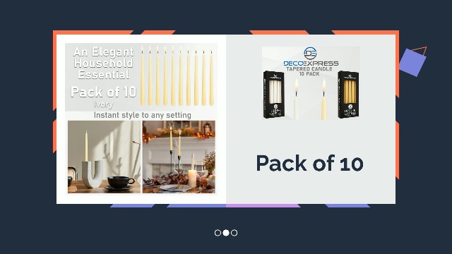 Illuminate your space with the Deco Express Dinner Candles. This ivory pack of 10 non-drip, long-lasting tapered candles offer up to 8 hours of warm, unscented light. Ideal for dining tables and special occasions.