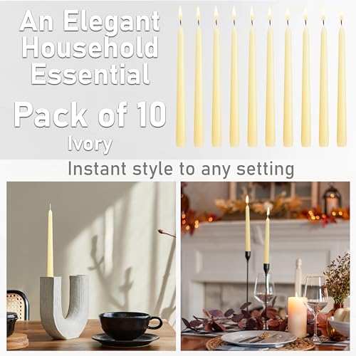 Deco Express Dinner Candles Pack of 6, 10, 15 or 50 Tapered Candles Non Drip Long Lasting 8 Hours, Unscented (Ivory – 10 Pack)