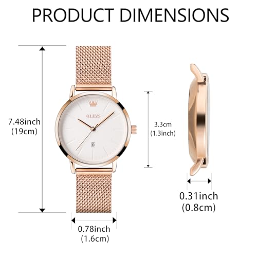 Experience timeless elegance with OLEVS Ladies Ultra Thin Watches. Featuring a big dial, stainless steel mesh strap, and Japanese quartz movement, this waterproof watch is perfect for any occasion. Available in rose gold with a white dial or classic silver with a blue dial, this ladies dress watch includes a convenient date display.