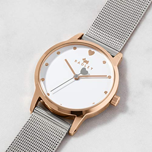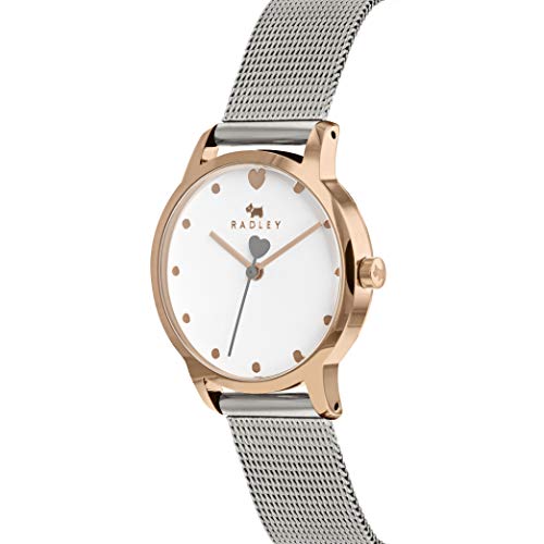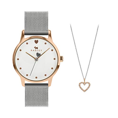 RADLEY Heart Dial Ladies Silver Stainless Steel Mesh Strap Contrast Hand Watch with Heart Necklace RY4411A