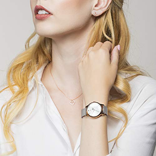The RADLEY Heart Dial Ladies Silver Stainless Steel Mesh Strap Contrast Hand Watch with Heart Necklace RY4411A exudes elegance and charm. This exquisite piece features a stylish heart dial encased in durable silver stainless steel, complemented by a sleek mesh strap that ensures both comfort and sophistication. Paired with a beautifully crafted heart necklace, it makes for the perfect gift set. Variations include a rose gold option, which adds a warm, luxurious touch, and a minimalist black strap version for a more contemporary feel.