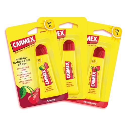 Carmex Cherry, Classic & Strawberry Tube 3-Pieces Mixed Pack SPF15, 10 g (Pack of 3)