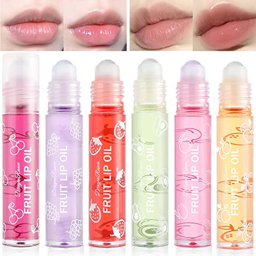 6 Pieces Roll-on Fruit Lip Oil Set,Moisturizing Lip Gloss Oil Set, Transparent Plumping Liquid Lipstick for Women and Girls Lip Care (Strawberry,Watermelon,Honey peach,Orange,Avocado,Coconut)