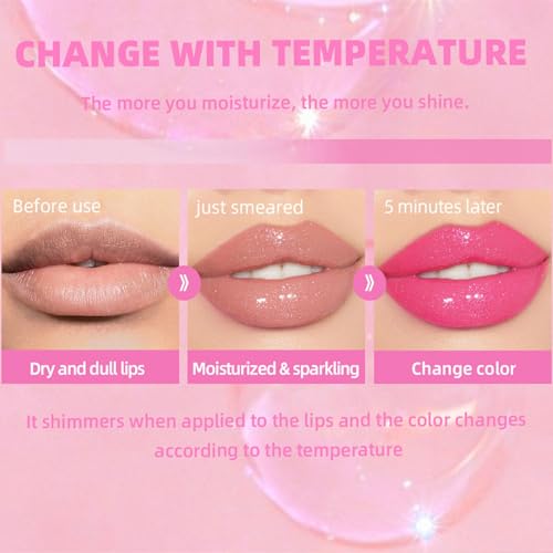 Magic Colour Changing Lip Oil, Glitter Lip Gloss – Long Lasting Plumping Lip Gloss Lip Glow Oil – Big Brush Non-Sticky Tinted Lip Oil Pink Lip Gloss Lip Care for Women
