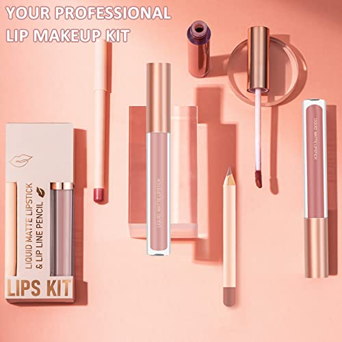 Prreal 2Pcs Lip Liner and Lipstick Makeup Set, Matte Liquid Lipstick + Matching Lip Liner, Nude Velvety Lipstick Makeup Kit, Waterproof Long Lasting labiales mate 24 horas originales (01)