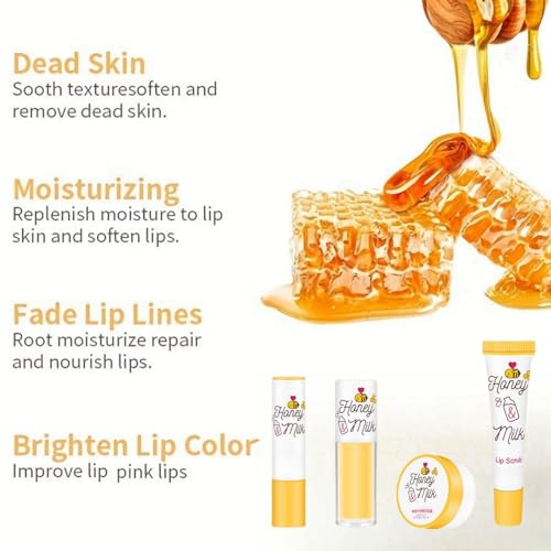 4PCS Lip Balm Set,Lip Balm Repair,Honey Milk Moisturizing and Plump Lip Care Set,Lip Hydration Exfoliating Minimizing Lip Lines Brightening Lip Repair,Lip Mask Lip Balm Lip Scrub Lip Oil