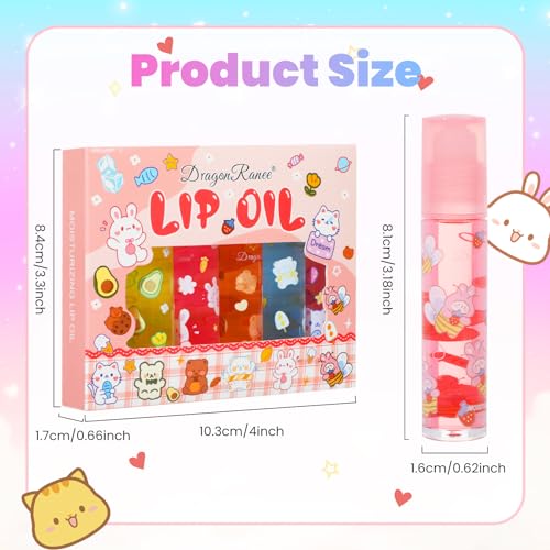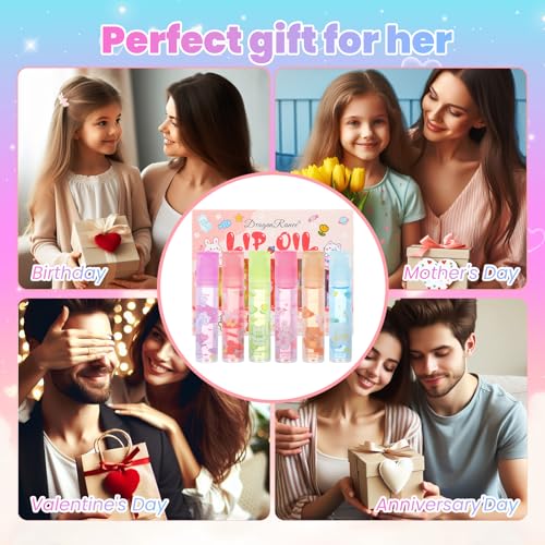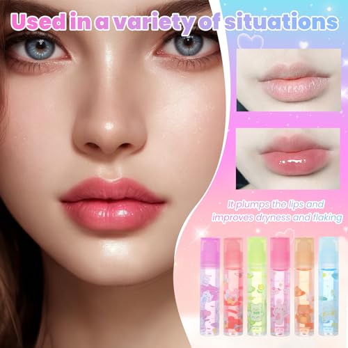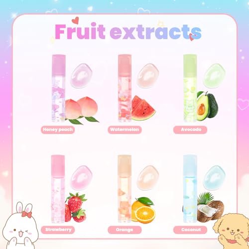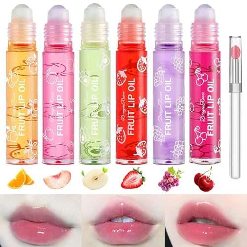 6 Pieces Moisturizing Fruit Lip Oil Set, Long-Lasting Roll-on Lip Gloss Oil Set, Clear Plumping Liquid Balm for Women and Girls Lip Care(Strawberry,Watermelon,Honey peach,Orange,Avocado,Coconut)