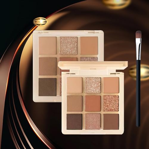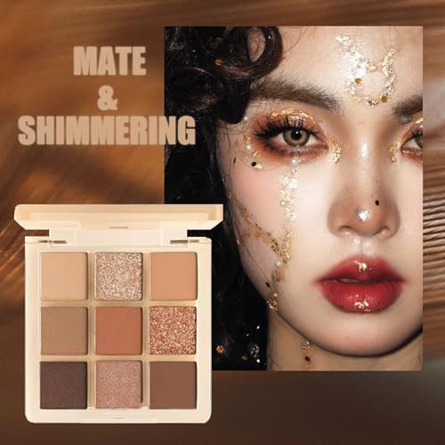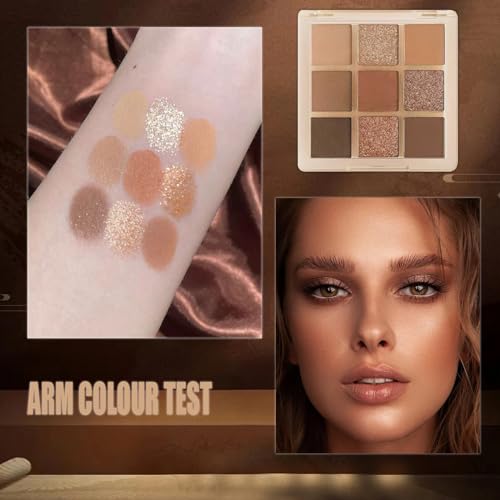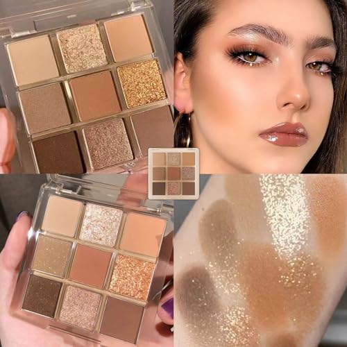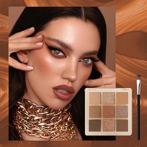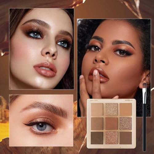 Brown Glitter Eyeshadow Palette, Shimmer Mate Make-Up Palettes Eye Shadow Pallets for Women, 9 bronze Colour Natural Waterproof Long Lasting Shimmering Palette with Brush, Gift for Girls
