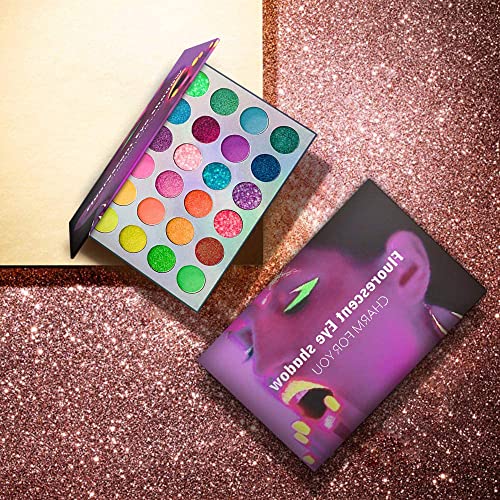 Kalolary Neon Luminous Eyeshadow Palette, UV Glow Blacklight Matte and Sparkling Eyeshadow Glows Iin The Dark, 24 Colors Highly Pigmented Makeup Kit with 4 Black Brushes