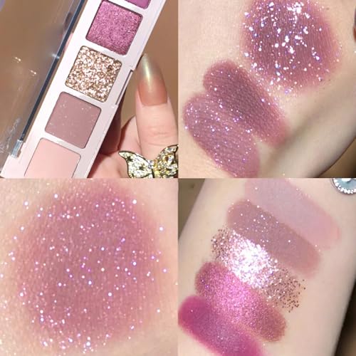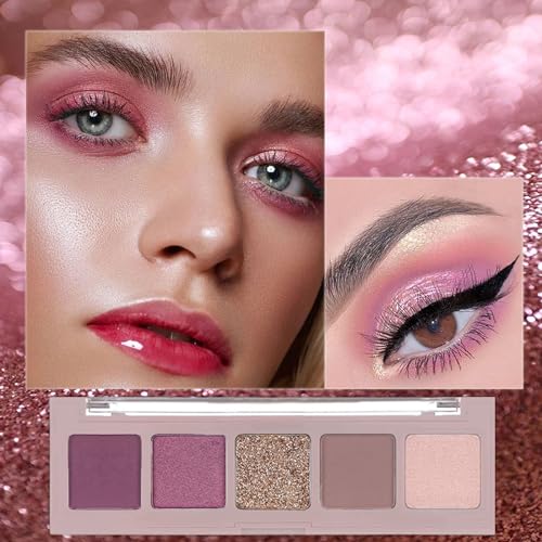 Pink Eyeshadow Palette Make-Up Purple Palettes, Shimmer Eye Shadow Pallets for Women, Cool Girl Matte Make Up, Glitter Eyeshadows 5 Colour Nude Natural, Waterproof Long Lasting Highly Pigmented