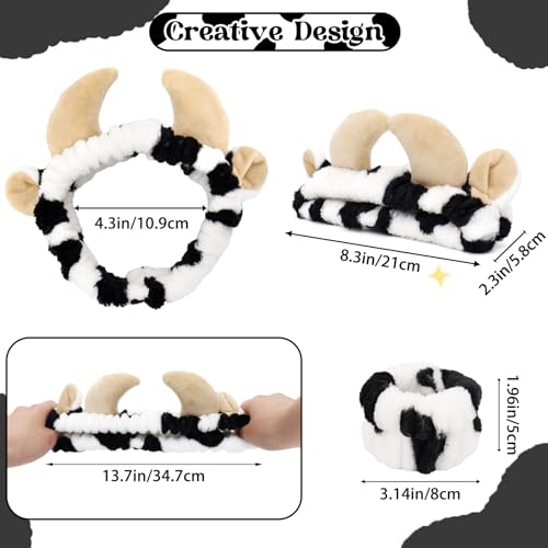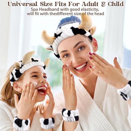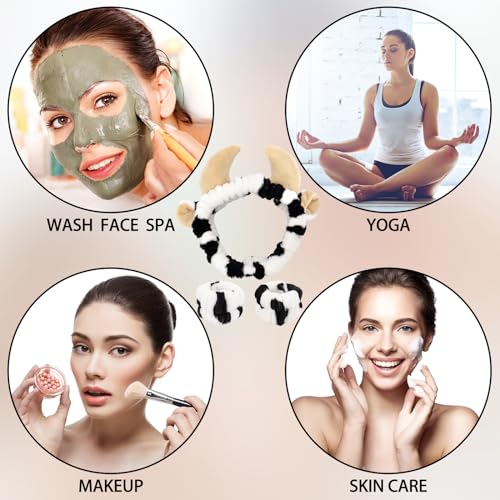 GADITIEK 3 Pcs Makeup Headbands Set for Washing Face, Cute Cow Spa Skincare Headband Animal and Face Wash Wristbands for Women Girls, Soft Fluffy Bubble Hair Band for Shower Sports Beauty
