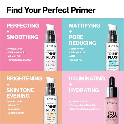 Revlon Prime Plus Makeup & Skincare Primer, Mattifying and Pore Reducing with Salicylic Acid and AHA, 30ml is renowned for its dual benefits. Available in two other variations: Brightening & Skin-Tone Evening with Vitamin C and Lactic Acid, and Perfecting & Smoothing with Vitamins B5 & E.
