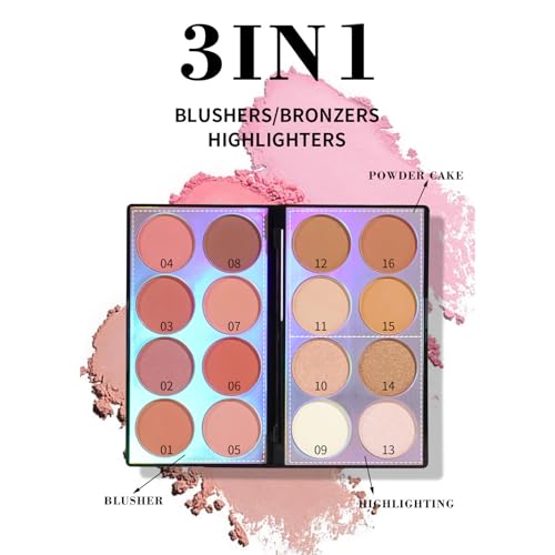 RoseFlower 16 Colors Blush Contour Highlighter Makeup Palette with Brush, Shimmer Matte Mineral Face Blush Powder for Cheek, All in One Face Sculpting Bronzer Blusher Illuminator Concealer Palette